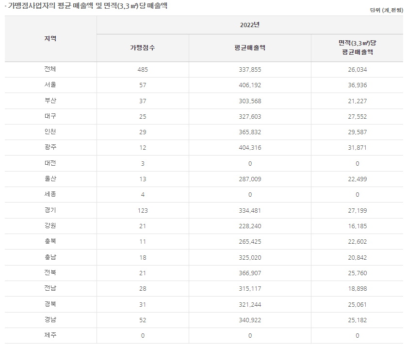 2022년 기준 485개점 평균 매출액